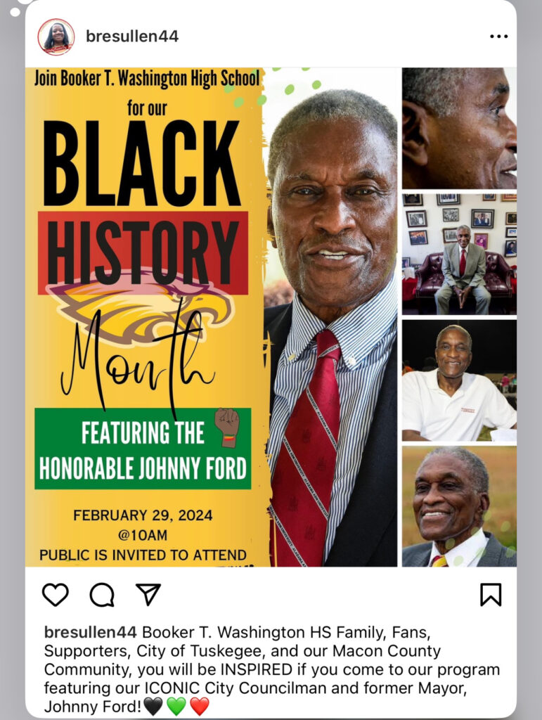 The public is invited to celebrate and salute The Honorable Johnny Ford at the Tuskegee Booker T Washington High School at 10:00 TODAY. A Black History celebration hosted by The World Conference of Mayors, Inc. (WCM)will take place at the Tuskegee Municipal Complex at 12:00 TODAY honoring the Mayors of the Alabama Conference of Black Mayors, Inc. (ACBM), and other Black elected and appointed public officials and leaders. TUSKEGEE BTW STUDENTS AND ALABAMA BLACK PUBLIC OFFICIALS INVITE YOU TO JOIN THEM IN CELEBRATING ALABAMA’S BLACK HISTORY.