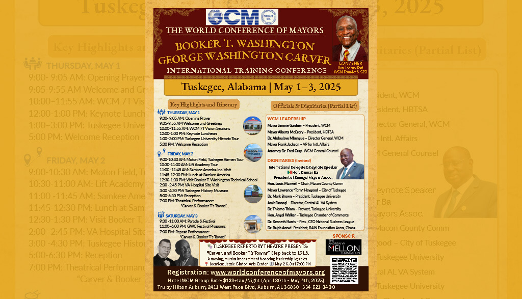 Through the combined experience of The WCM/HBTSA/NPA Conference Training Sessions, speeches by, and meetings with, local, national, and international, government officials, lectures by and discussions with University professors and officials, tours of Tuskegee National Historic Sites, a theatrical presentation by Tuskegee Repertory Theatre, and the George Washington Carver Festival (open to the public on Saturday May 1 st .) This conference will provide the opportunity for you to walk upon the hallow grounds of the historic City of Tuskegee, which includes famed HBCU, Tuskegee University, (TU). In so doing you will be able to study, learn, and be inspired by, the lessons past and present, taught through the lives and work of great Tuskegee/African American heroes and sheroes: Tuskegee University Founder, Lewis Adams; TU Founding President, Dr. Booker T. Washington; TU agricultural scientist and researcher Dr. George Washington Carver; Tuskegee native, Civil Rights leader, Mrs. Rosa Parks, and the “Flying/Fighting” heroes of World War II, the Tuskegee Airman, Civil Rights Attorney Fred Gray, and others.